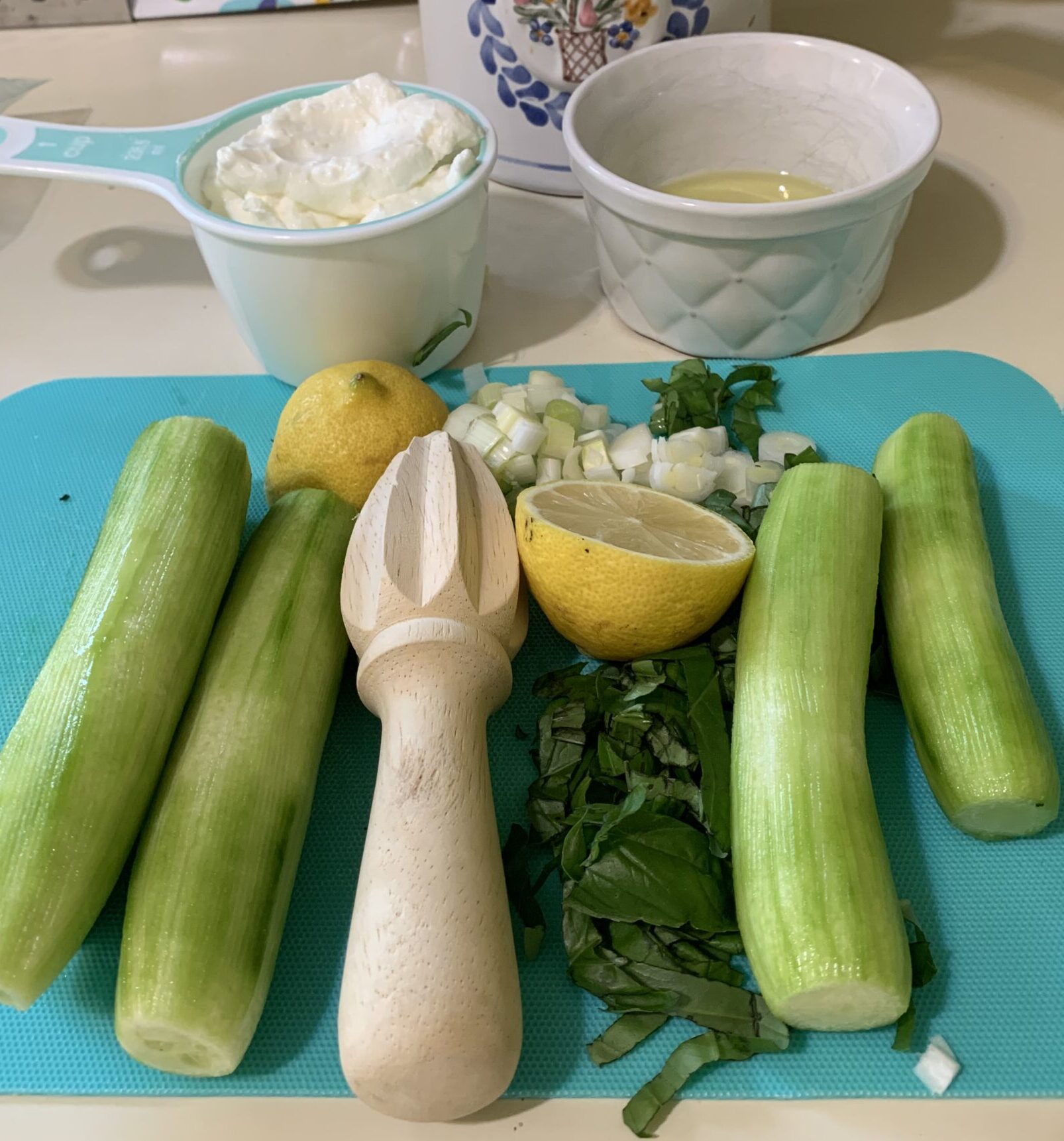 - On a cutting board, chop up the herbs and slice up the cucumbers.