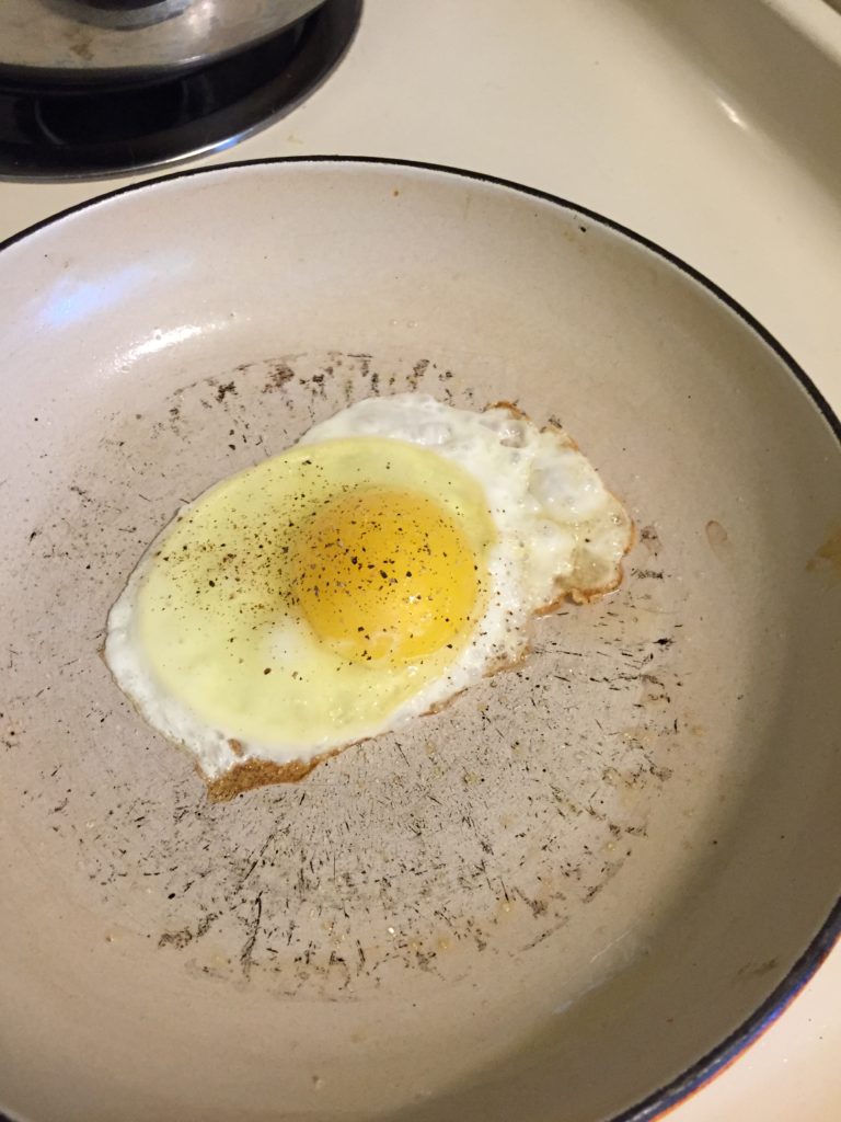 Flip back over and slide onto the toast. Sprinkle with as much grated parmesan as you like. I like two or more teaspoons. Cover the plate with the skillet for a few minutes. This will slightly melt the cheese and warm up the avocado mixture. Sometimes, I just omit putting the skillet on top and instead, I warm it 20 seconds in the microwave. If you don’t care about melting the cheese or warming the avocado mixture slightly, then just eat it as is, once the egg  goes on top.