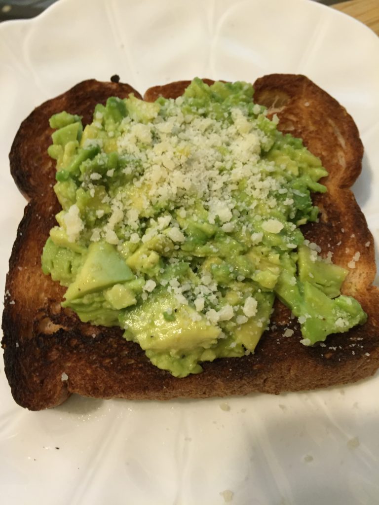 - Meantime, place your toast in the toaster. When it is done, place it on a plate. Smear the mashed avocado all over the warm toast. Sprinkle it with a nice tablespoon of parmesan cheese. Set aside.