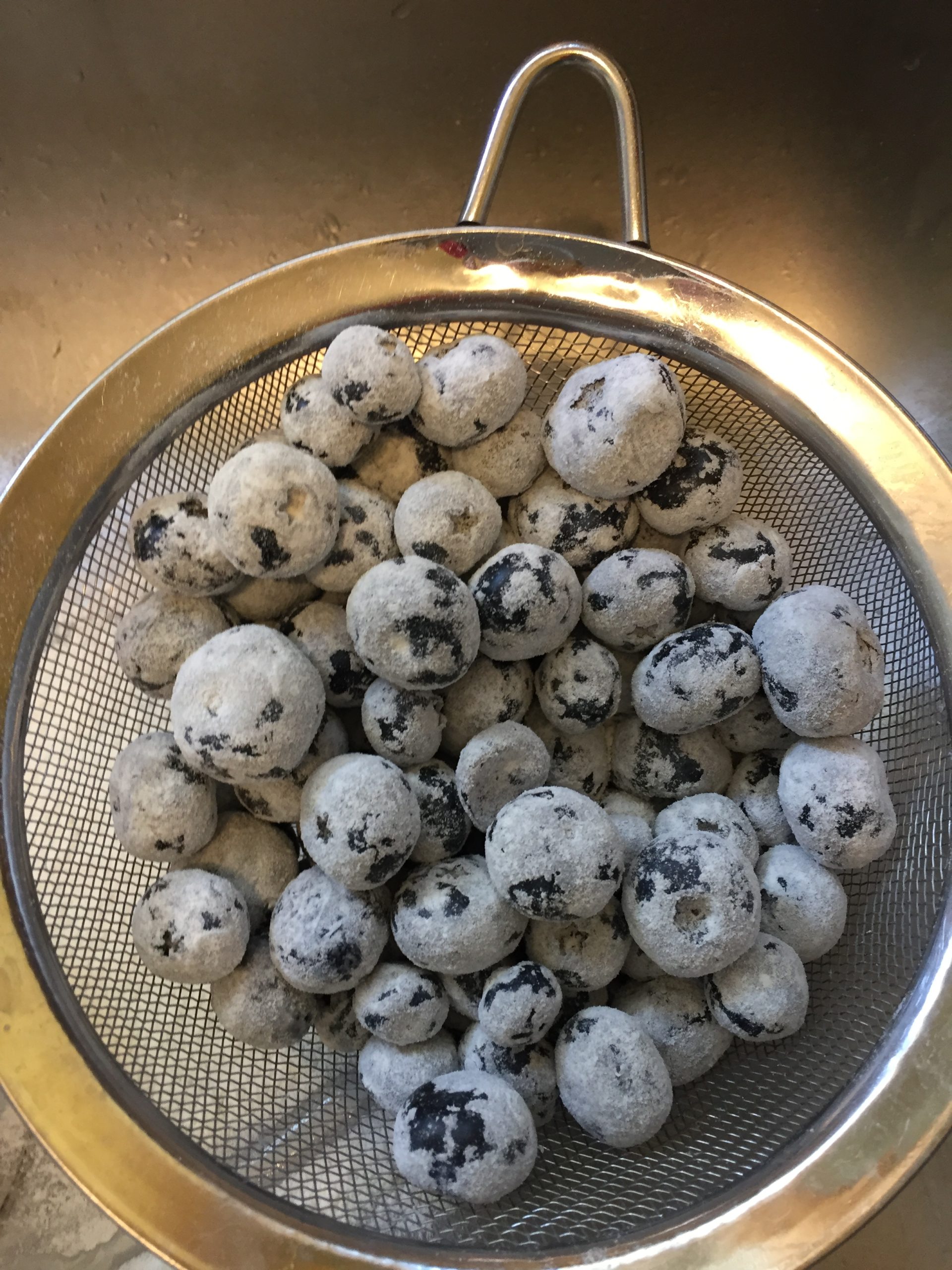- Pour the berries into a sieve over a soup bowl and sprinkle the 3 Tbsp of flour over them. Shake the sieve until the berries are all coated with the flour but the excess flour shakes out into the soup bowl. This will prevent them from ruining the cake by sinking to the bottom of the pan while baking.