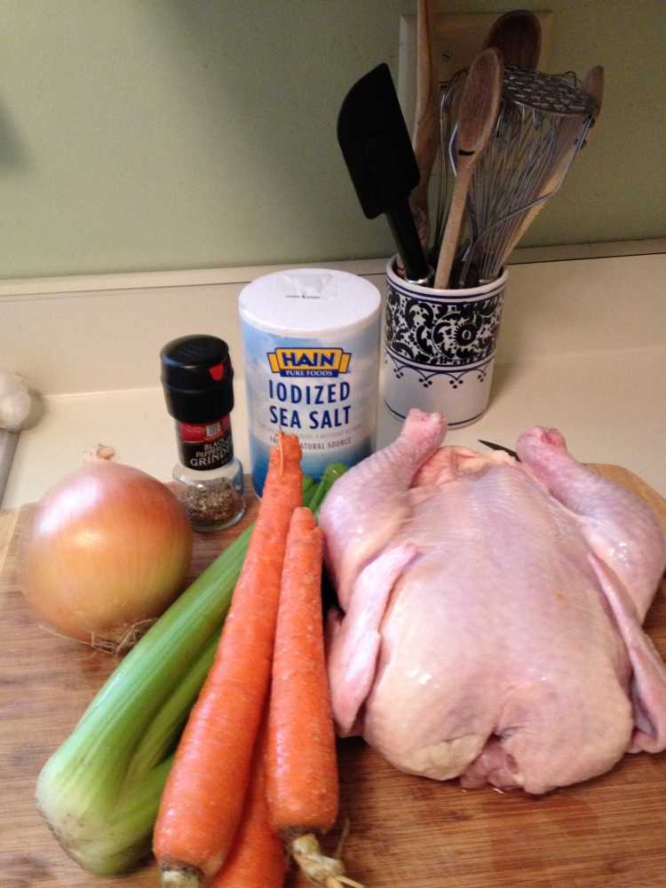 I use a big, fat organic chicken, carrots, celery, salt and pepper. Instead of onions, I use green stems of scallions or spring onions and chopped chives (Use onions if you don’t need to be low fodmap). I also use a handful of fresh herbs such as chopped basil and Italian parsley that add complexity, but don’t take away from the wonderful chicken flavor.