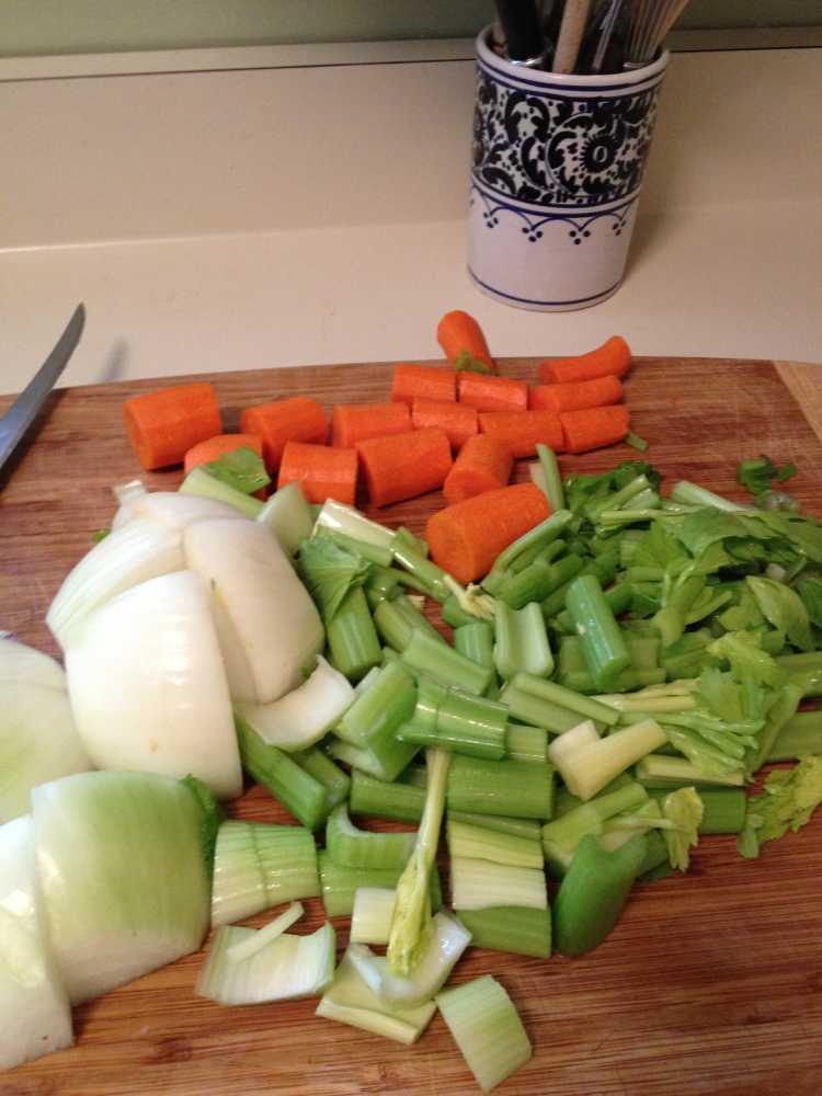 Place all the vegetables on top of the chicken in the soup pot. (Ignore the onions in the picture. Picture is from my old blog before I had to go low fodmap. lol )