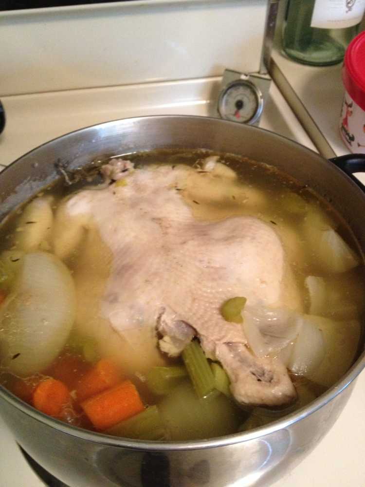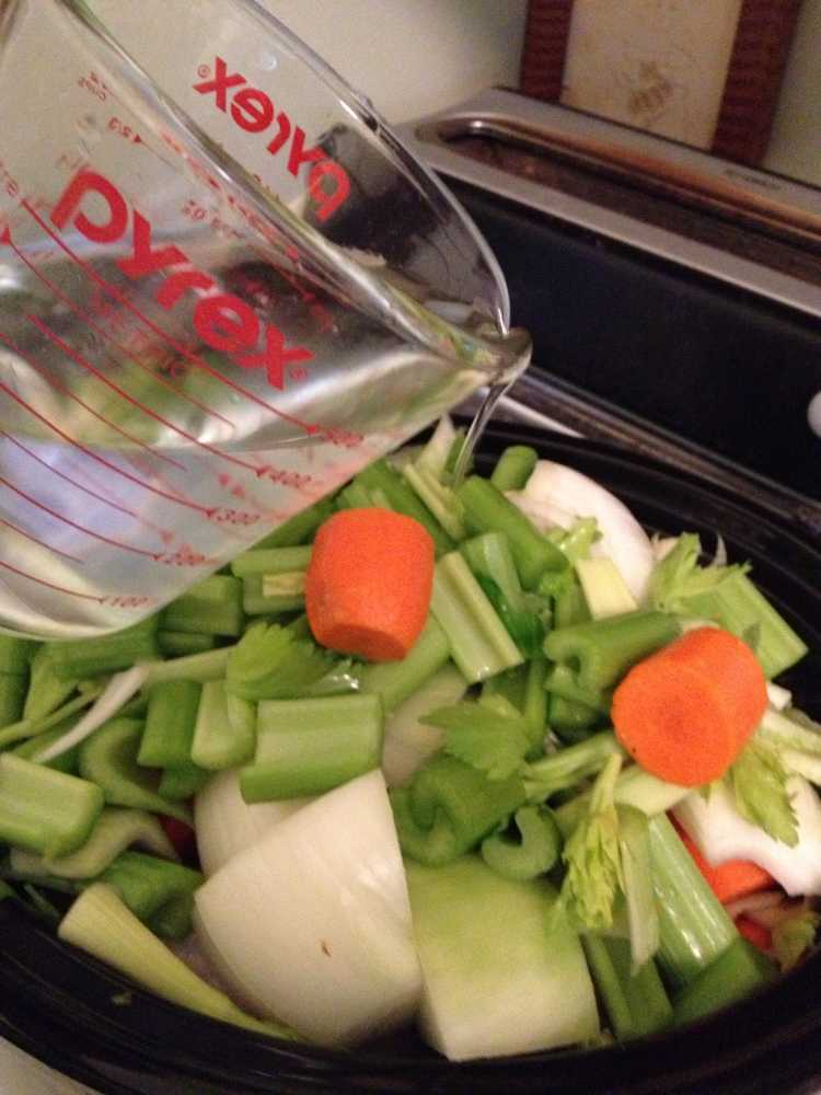 - Add 8 cups of cold water to the chicken and vegetables in the soup pot. Add 1 tbsp sea salt to the water.Turn the heat to high, cover the pot, and bring the liquid to a boil. At this point, some people like to remove the scum because it looks scary. I myself am not scared of scum and I dare to leave it in. Do not tell my mother this.