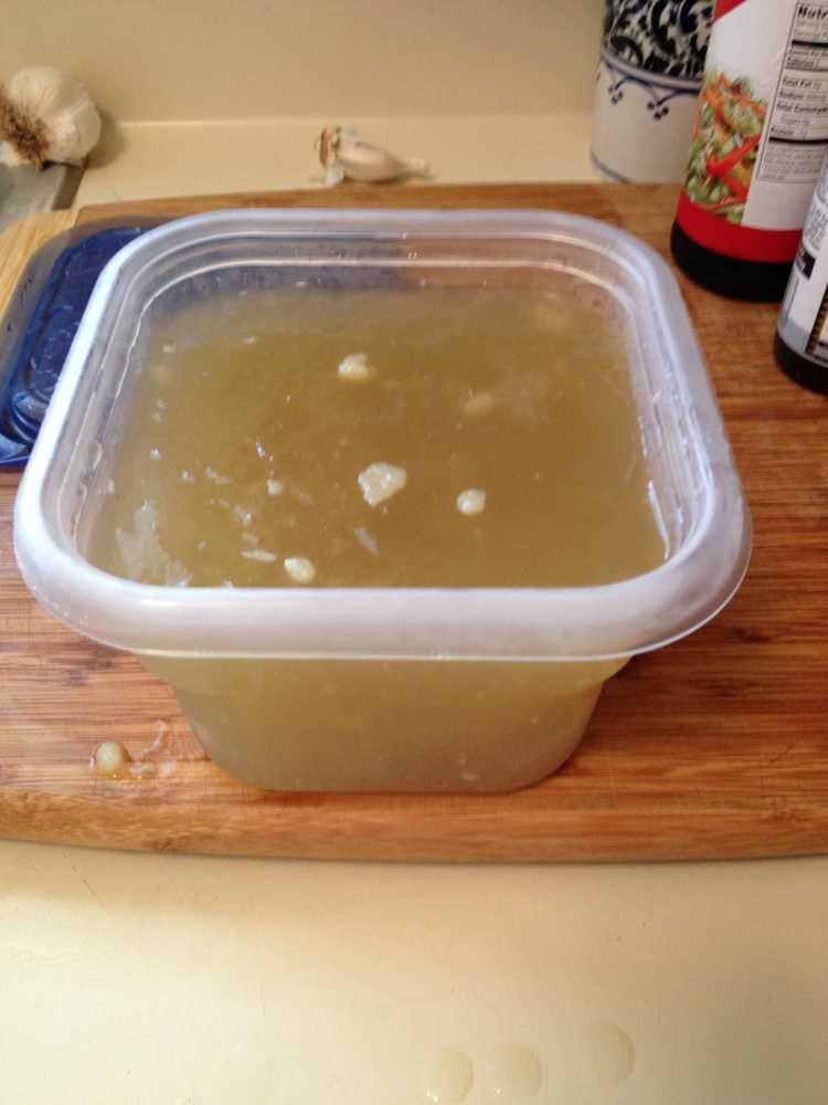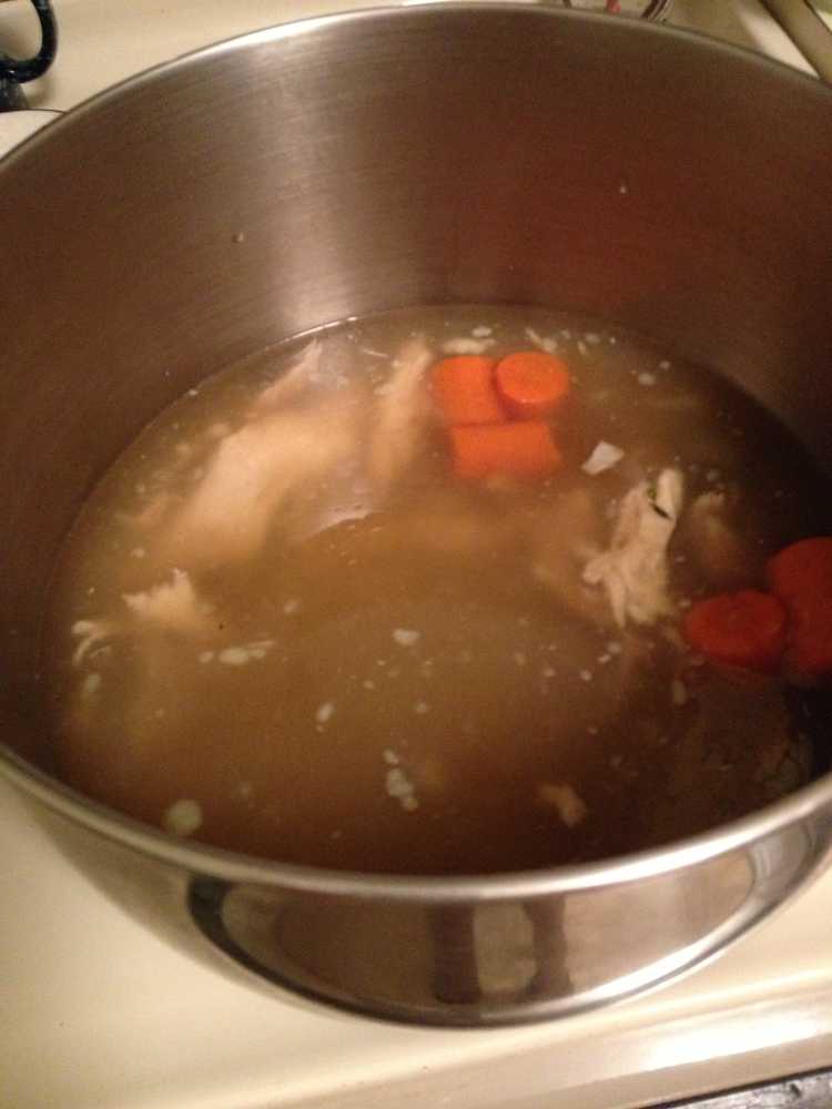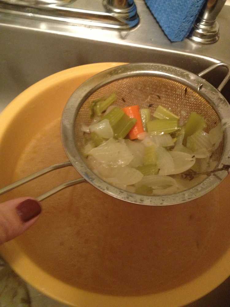 - Pour the soup into a fine strainer that has been placed over a bowl so that the vegetables go into the strainer and the soup goes into the bowl. I fish out the cooked carrots and place them in the strained soup. Refrigerate the soup covered for several hours or until the fat rises to the top and can be removed. I usually let the soup stay in the fridge all day and I use it that night or the next day. If you don't plan to use the soup right away or the chicken meat , place both soup and chicken meat in plastic containers and freeze until planning to use them.