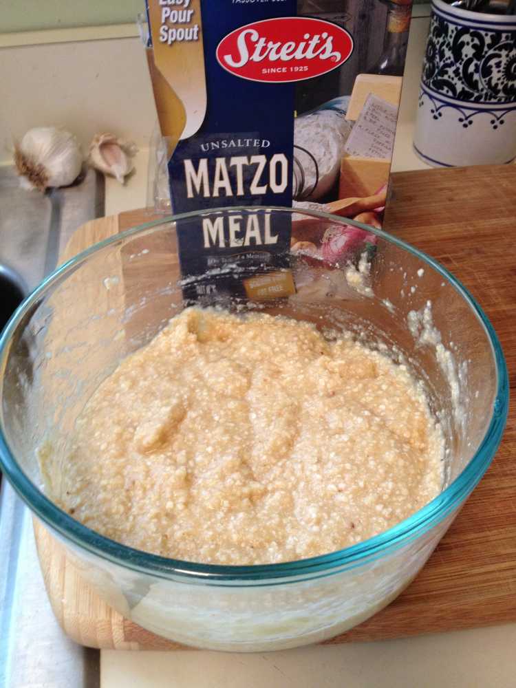 - Mix blended egg mixture, matzoh meal, melted chicken fat, club soda and salt in a medium bowl. Mixture resembles wet sand, but firms up as it chills. Cover the bowl and chill in fridge for at least two hours. Mixture can be made one day ahead.