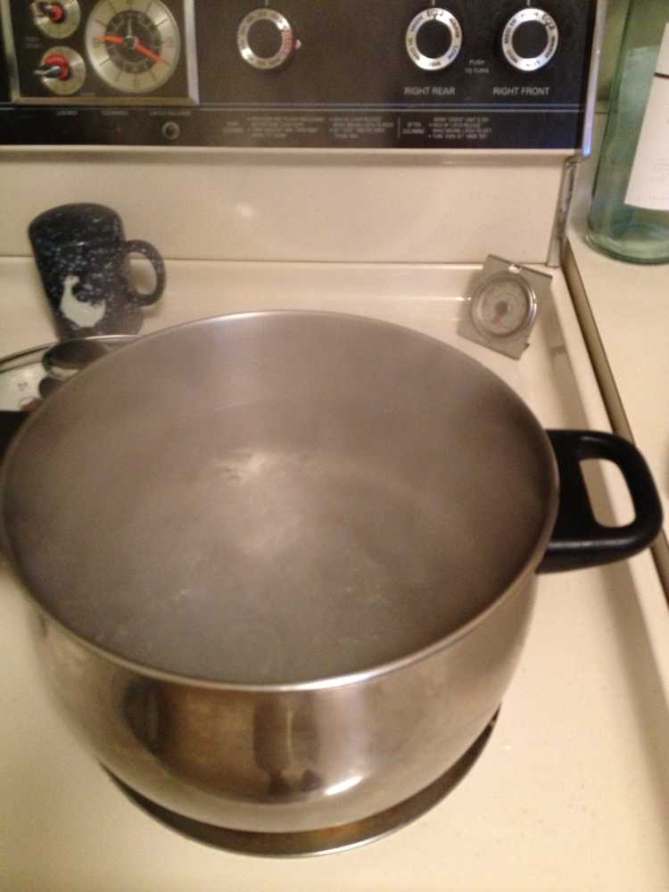 Heat up one to two quarts of the chicken soup. I usually add in some of the chicken breast meat and sliced up cooked carrots I saved from making the soup. I turn off the heat and set the soup aside for later, after the matzo balls are done