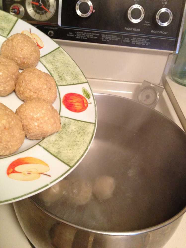 - Bring 4 quarts of salted water to a boil. While waiting for the water to boil, take the matzo mixture out of the fridge. Scoop out 2 tbsps of matzoh meal mixture at a time and form into nice round balls using wet hands to keep the mixture from sticking to your hands.