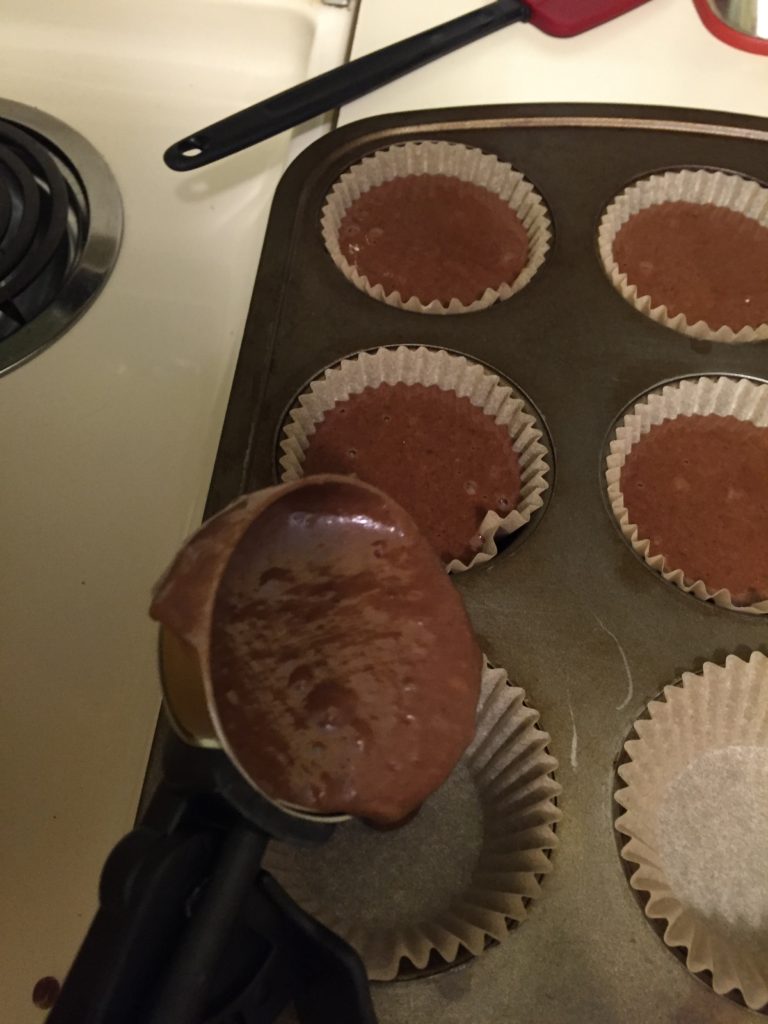 Scoop the batter evenly into the muffin paper liners until half full. (2 small cookie scoops each.) Sprinkle two chocolate chunks on top of each cupcake and push down a bit, but not submerged totally.