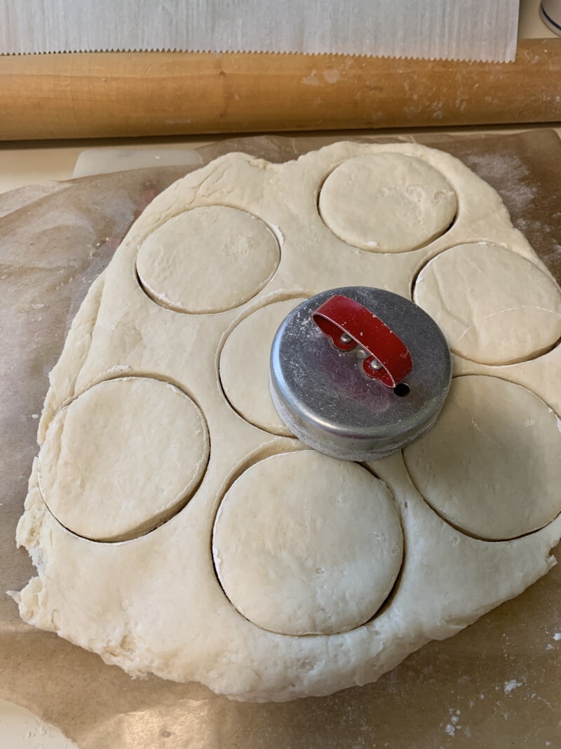 With a rolling pin, roll out the biscuit dough to the height you like. I like a bit higher than 1/4″. Using a biscuit cutter or other round form like a glass dipped in flour, cut out biscuits and place them on a parchment or foil lined baking sheet. Roll up the scraps and roll out again, cutting biscuits until all the dough is used up.