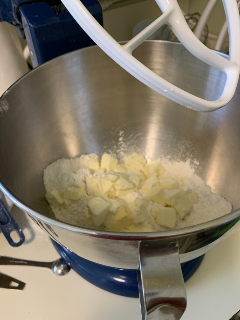 Fit the mixer with the paddle. Add the cold diced butter or other shortening cubes. Setting the mixer on low, run the mixer for 3 to 5 minutes or until the flour butter mixture looks like cornmeal. Turn off the mixer.
