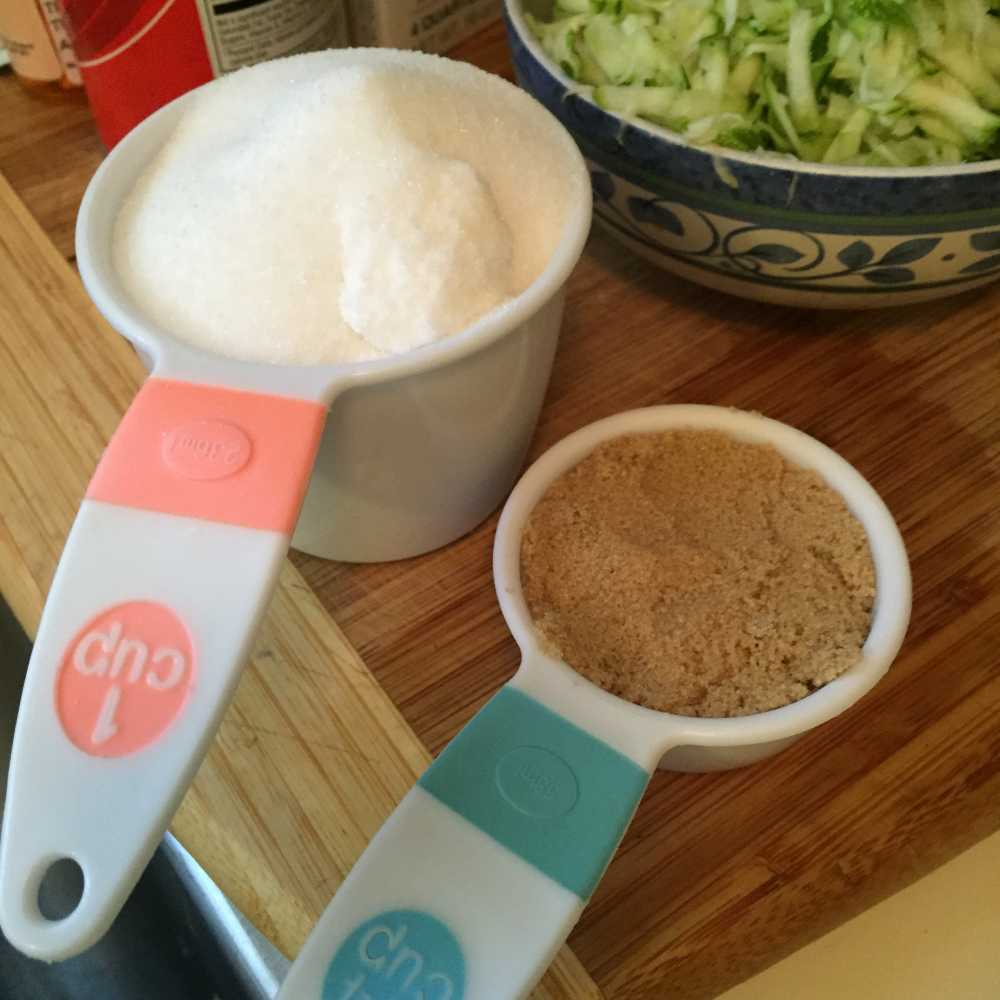 Carefully wash, dry and then grate a medium zucchini using the large holes of a box grater. Measure out about 3 cups of grated zucchini into a small bowl. Set aside. Measure out the white and brown sugar and set aside.