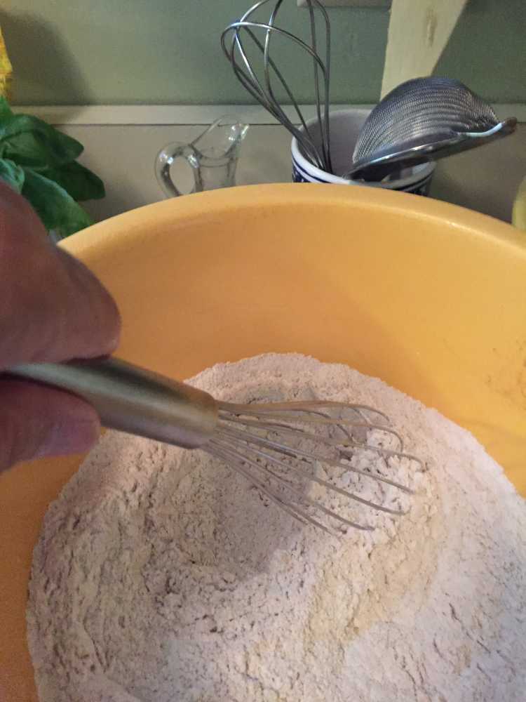 In a large bowl place the 2 cups all purpose flour , one cup white whole wheat flour,(or 3 cups KA Measure for Measure flour), the two teaspoons of baking soda, the salt and all the spices. Whisk the dry ingredients together until they are well mixed. Set aside.