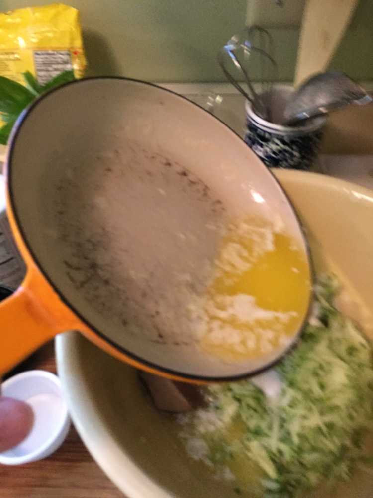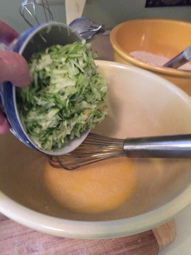 - In another large bowl, crack the two eggs and beat them slightly with a whisk. Add the white sugar and brown sugar to the eggs and whisk the sugar into the egg mixture. With a wooden spoon, stir in the grated zucchini and melted butter into the egg, sugar mixture. These are the wet ingredients.