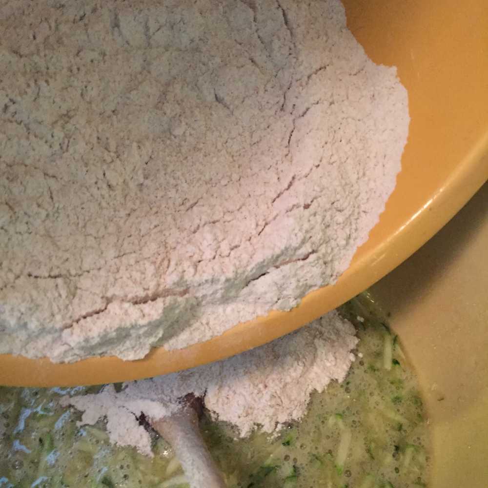 In another large bowl, crack the two eggs and beat them slightly with a whisk. Add the white sugar and brown sugar to the eggs and whisk the sugar into the egg mixture. With a wooden spoon, stir in the grated zucchini and melted butter into the egg, sugar mixture. These are the wet ingredients.